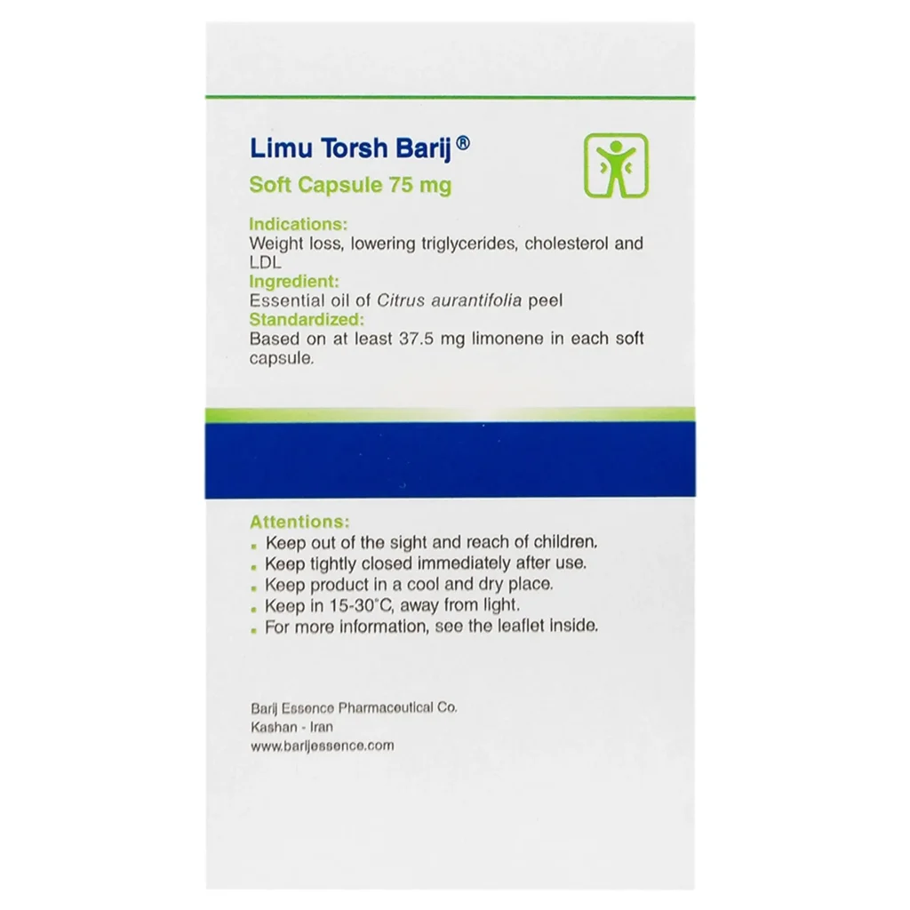 سافت ژل لیموترش باریج اسانس، یکی از محصولات دارویی بوده که حاوی اسانس پوست لیموترش است. این محصول به واسطه داشتن عصاره لیموترش، قادر است تا به کاهش تری گلیسرید و کلسترول خون کمک کرده و به کاهش وزن در فرد منجر شود. این محصول سوخت و ساز بدن را بالا برده و به کاهش وزن کمک شایانی خواهدکرد.