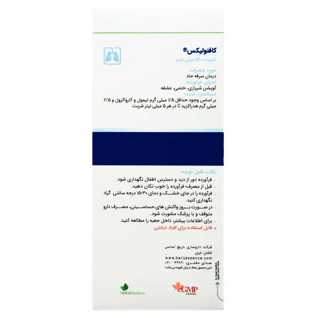شربت کافنولیکس باریج اسانس، حاوی عصاره گیاه آویشن، گیاه ختمی و گیاه عشقه است. این محصول به واسطه داشتن فرمولاسیون ویژه میتواند به درمان سرفه حاد بپردازد. این محصول فاقد شکر بوده و می تواند برای بیماران دیابتی قابل استفاده باشد.