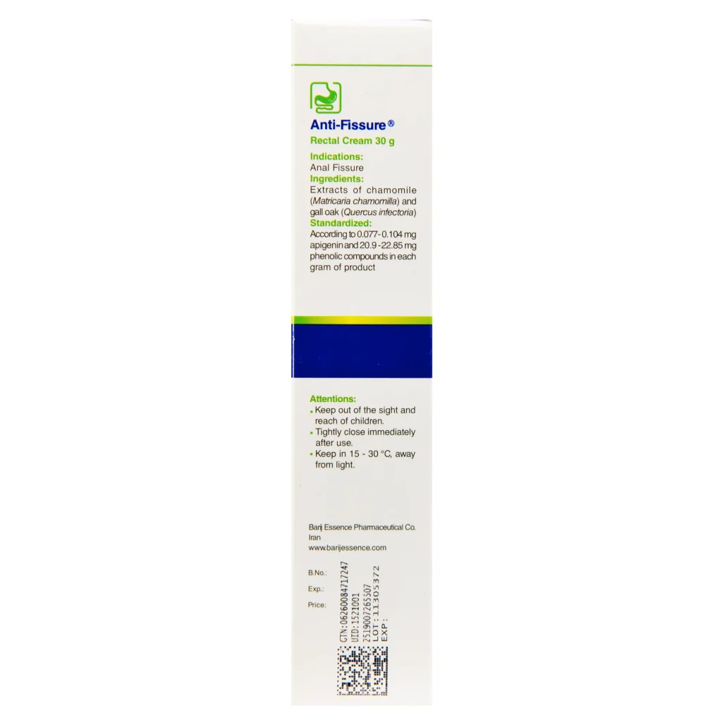 کرم آنتی فیشر باریج اسانس با داشتن ترکیبات طبیعی مانند عصاره گیاه بابونه که دارای اثرات ضدالتهاب و ضداسپاسم است و عصاره دارمازو که ضد درد و التهاب پوستی است، به بهبود و درمان شقاق مقعدی کمک میکند.