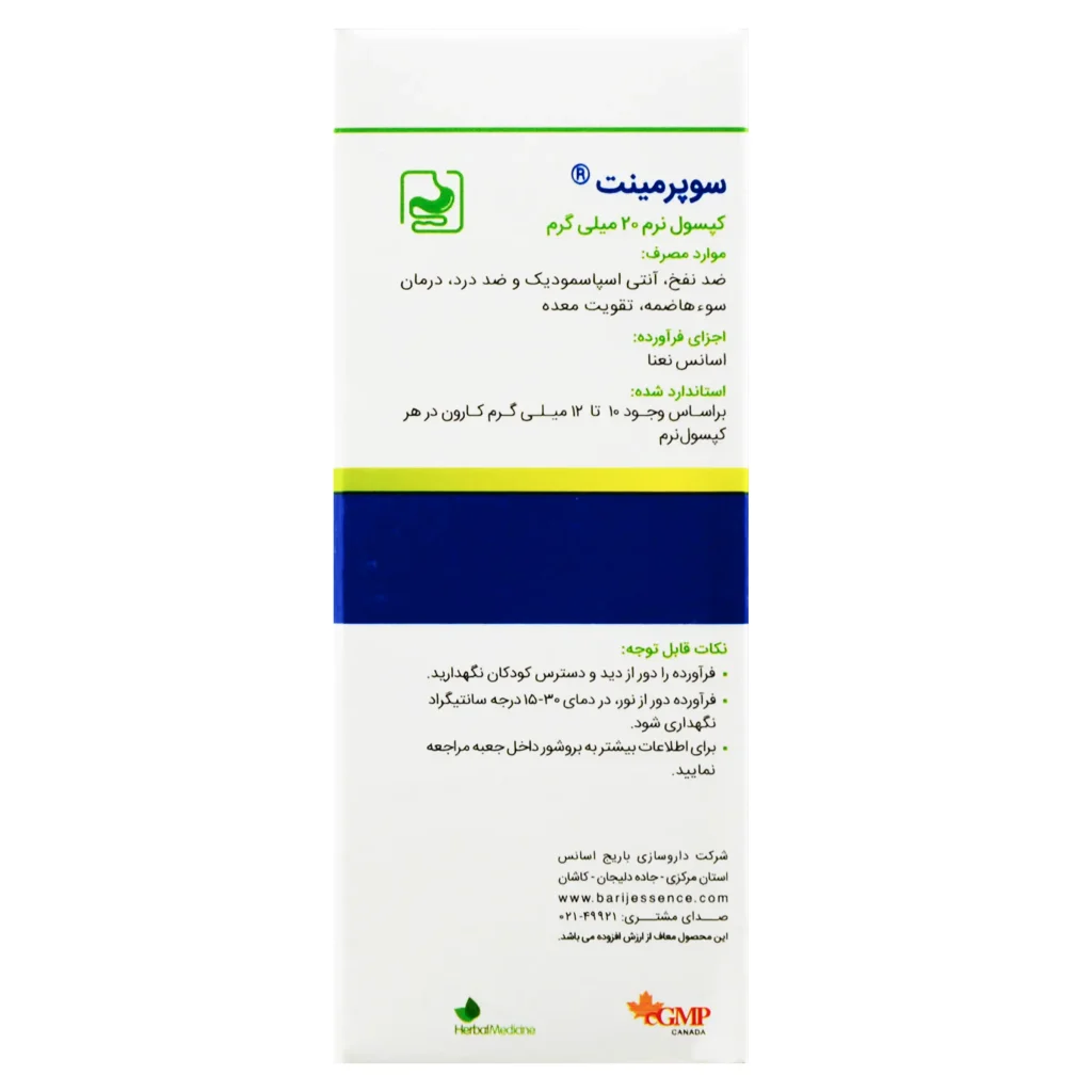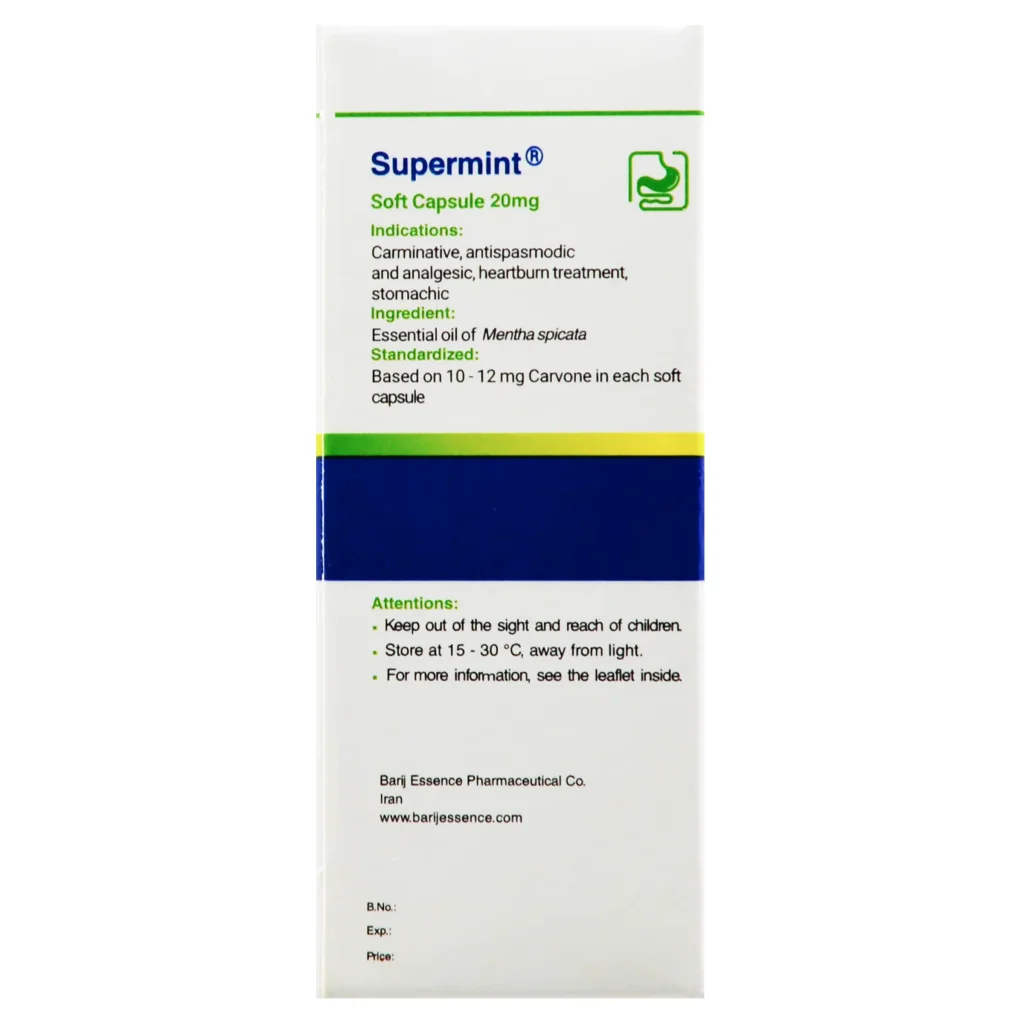 سافت ژل سوپرمینت باریج اسانس حاوی عصاره نعنا بوده و به عنوان یک داروی گیاهی بسیار فوق العاده جهت رفع مشکلات گوارشی از جمله نفخ و سوء هاضمه شناخته میشود. نعنا موجود در این محصول یکی از گیاهان باستانی است که بیش از 2000 سال پیش توسط انسان جهت رفع برخی از مشکلات گوارشی استفاده می شده است. نعنا موجود در سوپرمینت باریج اسانس به دلیل خواص ضد اسپاسم و افزایش جریان مایع گوارشی، سوزش سر دل را تسکین میدهد. این گیاه غدد بزاقی را فعال خواهد کرد که آنزیمهای گوارشی ترشح میکند و هضم را بهبود بخشیده و سوء هاضمه و شکم را درمان میکند. به طور کلی مصرف سافت ژل سوپرمینت منجر به درمان نفخ و سوءهاضمه، کاهش دردهای شکمی به دلیل داشتن خواص ضد درد و ضد اسپاسم، تقویت معده به دلیل دارا بودن خواص تقویتکنندگی فعالیت معده و هضم بهتر مواد غذایی خواهد شد.