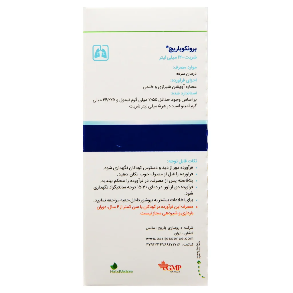 شربت برونکو باریج اسانس به صورت محلول 120 میلی لیتری موجود در قوطی پلاستیکی عرضه میگردد.