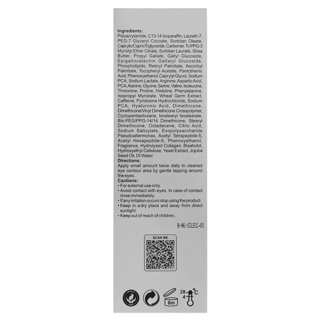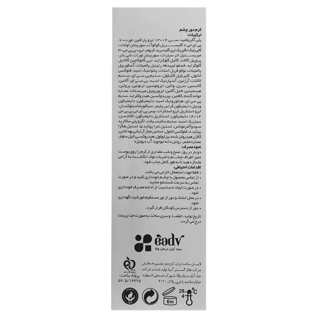 | مقدار و نحوه استفاده | پس از تمیز کردن پوست، مقدار کمی از کرم را با حرکات ضربه ای ملایم، روی پوست دور چشم ماساژ دهید تا جذب شود. |