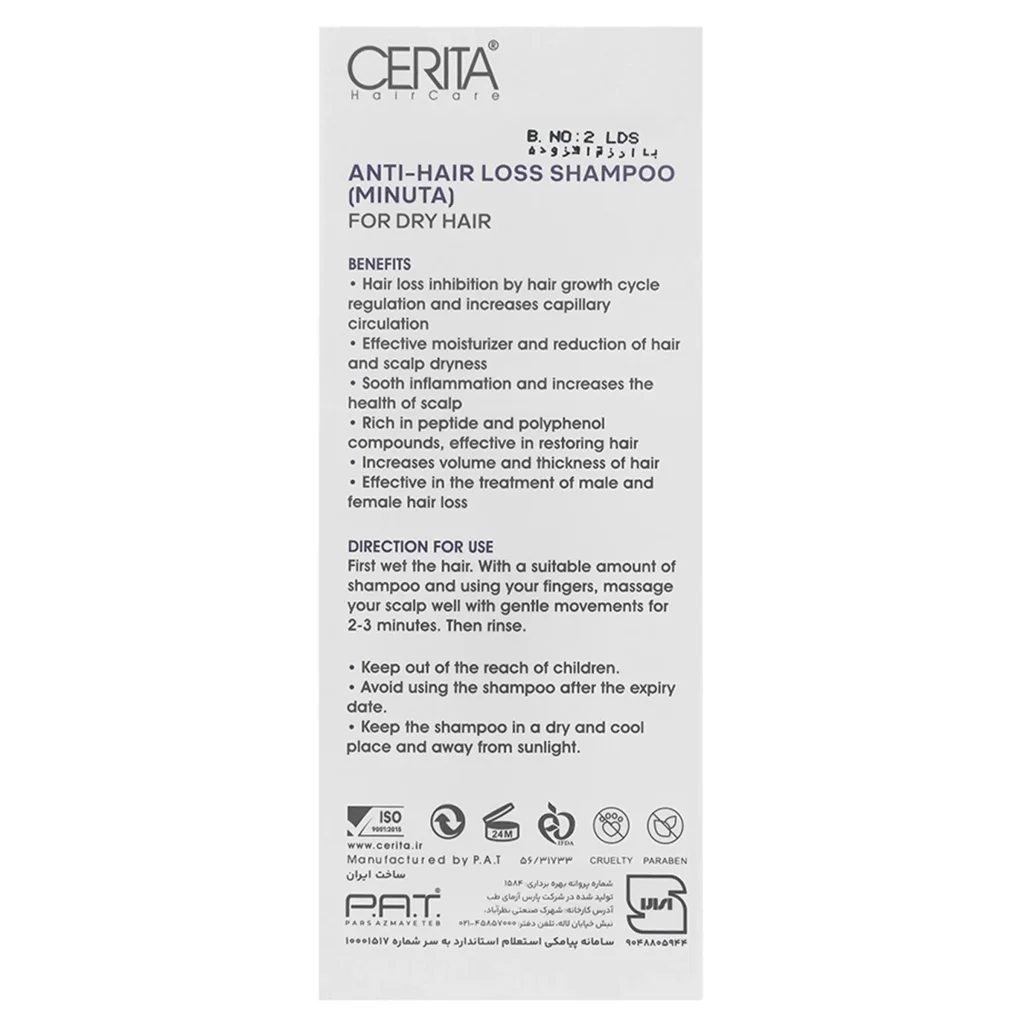 ویژگیهای شامپو تقویتی ضد ریزش موهای خشک مینوتا سریتا: