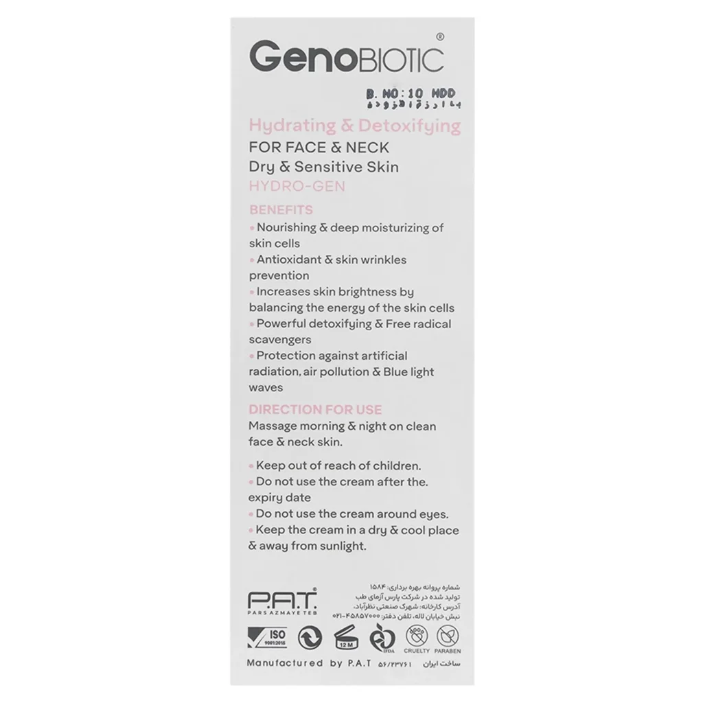 کرم رطوبت رسان صورت و گردن پوست خشک و حساس ژنوبایوتیک