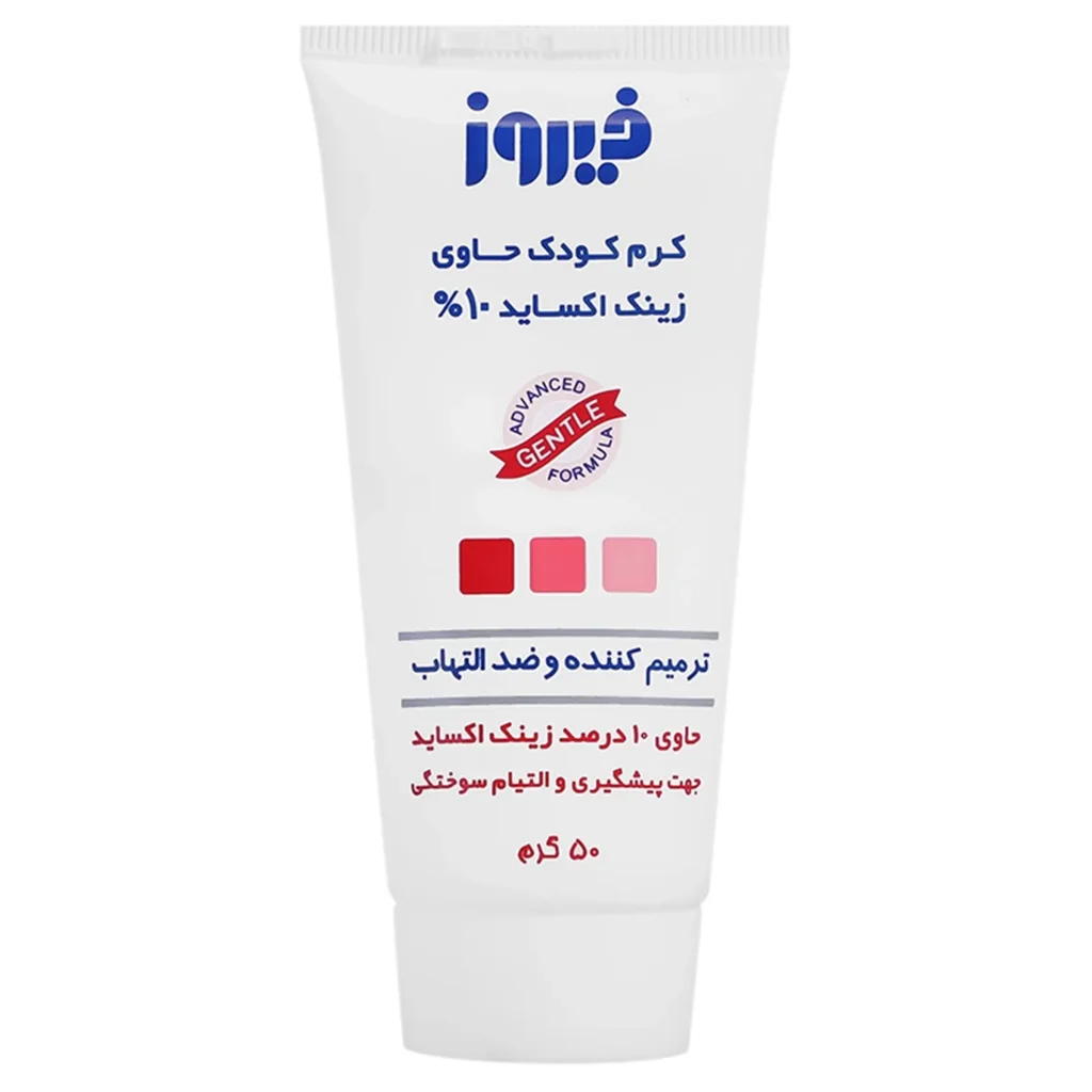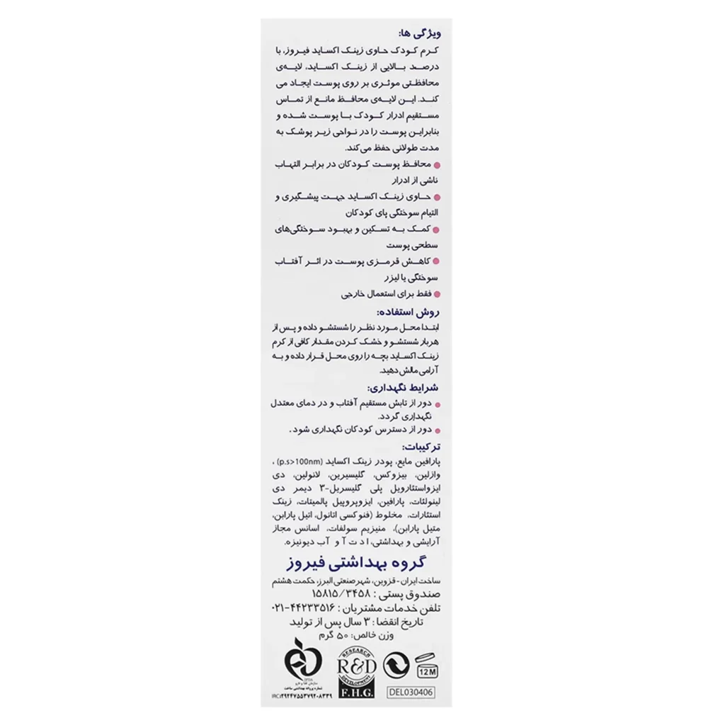 کرم بچه زینک اکساید فیروز، با ایجاد لایهای غیر قابل نفوذ بر روی پوست، موجب حفظ رطوبت در پوست میشود و خاصیت منقبض کردن پوست را دارد. این محصول برای درمان التهاب و سوختگیهای ناشی از عرق سوز و ادرار سوختگی نوزادان به کار میرود و موجب جلوگیری از خشک شدن و پوسته پوسته شدن در پوست میشود. محصول فوق گزینه مناسبی برای درمان و بهبود آکنه و التهابات پوستی کودکان است. کرم فوق حاوی لانونین برای حفظ رطوبت و نرم کنندگی پوست بوده و فاقد مواد حساسیتزا است. از مواردی که در تولید این محصول به کار رفته است میتوان به موم عسل اشاره کرد که موجب محافظت پوست در برابر سرما و عوامل محیطی نامطلوب است. کرم زینک اکساید، ضد باکتری است و خاصیت محافظت و درمان بثورات و سوختگی ناشی از ادرار را دارد.
