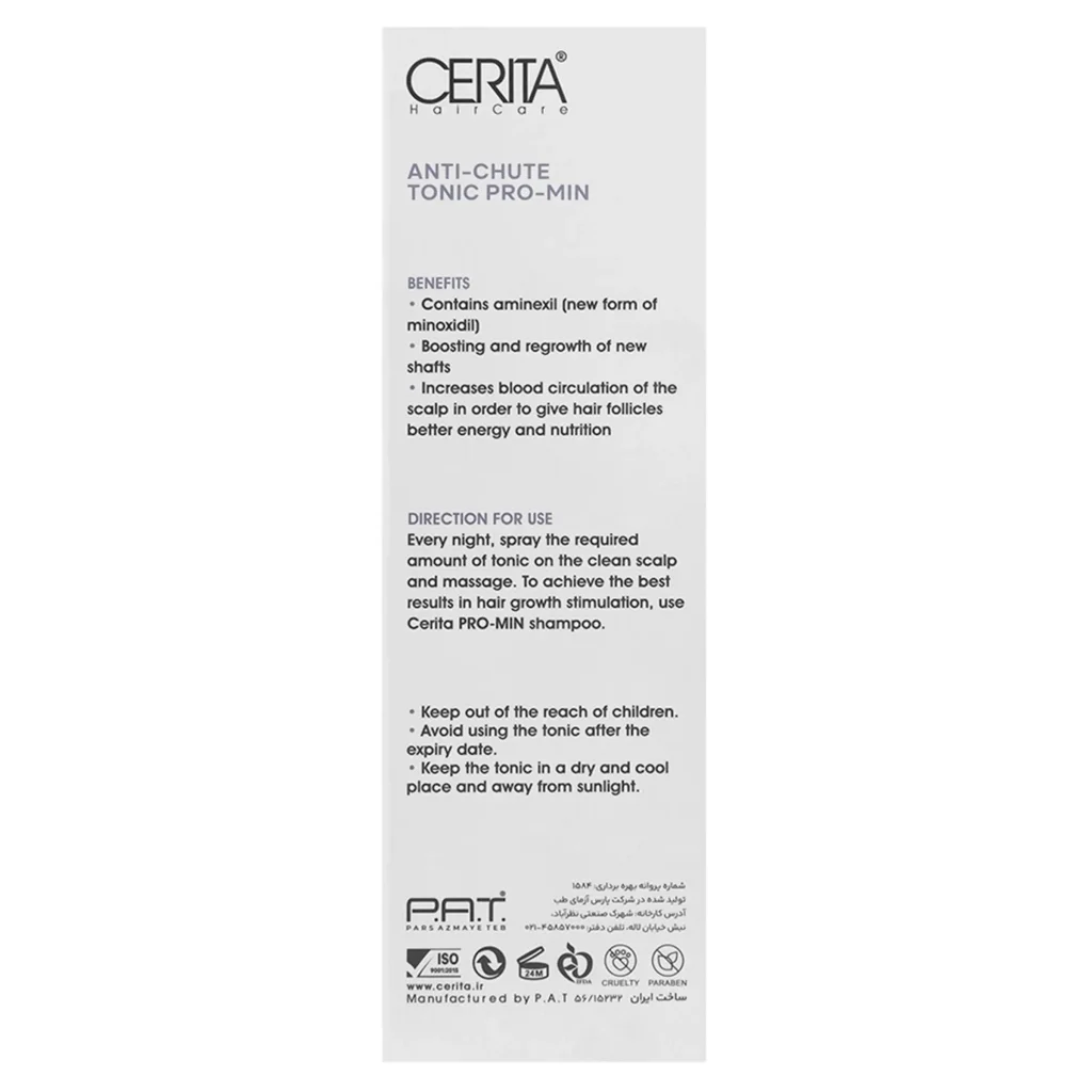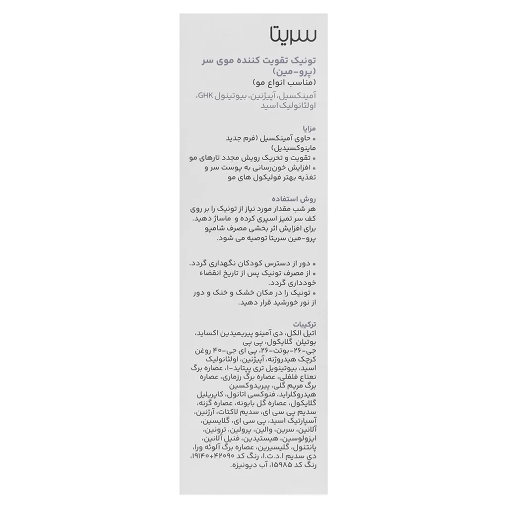 تونیک پرو مین سریتا به جای استفاده از ماده ماینوکسیدیل، از آمینکسیل استفاده کرده است. این ماده عوارض ناشی از قطع مصرف ماینوکسیدیل را ندارد و دارای اثر گذاری منحصر به فردی در کنترل ریزش مو میباشد.