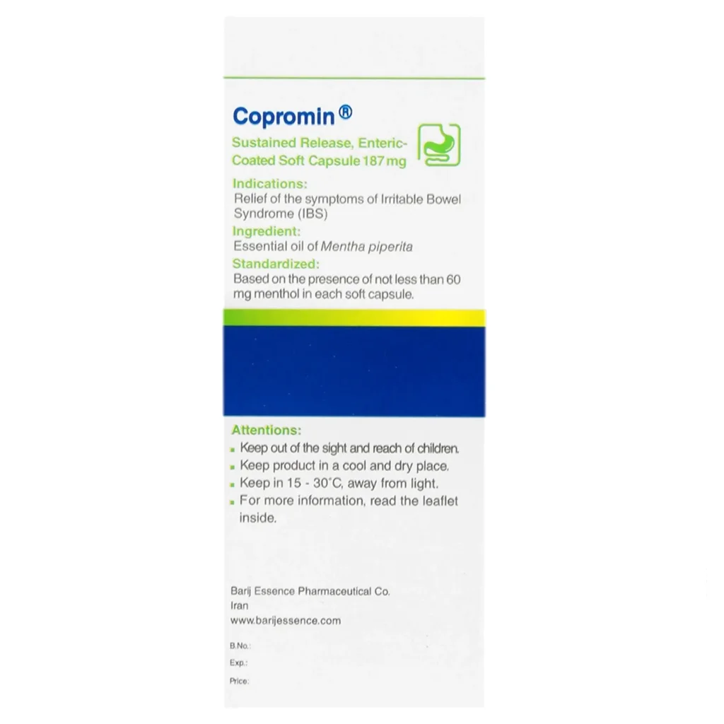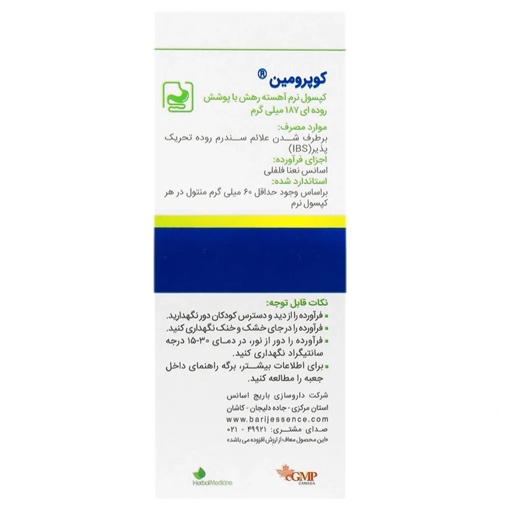 کپسول کوپرومین، به بهره گیری از فرمولاسیون آهسته رهش به گونهای طراحی شده است که ماده موثره آن به تدریج در دستگاه گوارش آزاد شده و اثر طولانیتری داشته باشد. منتول موجود در هر عدد کپسول کوپرومین در افرادی که به مشکلات گوارشی مانند نفخ، سوءهاضمه و حتی سندرم روده تحریک پذیر (IBS) مبتلا هستند، میتواند به کاهش علائم آنها کمک کند. کوپرومین با فرمولاسیونی که دارد برای افراد بالای 15 سال قابل استفاده است. نعناع فلفلی گیاهی دارویی از خانواده نعناعیان است که به واسطه ترکیبات فعالی مانند منتول، دارای خواص ضد اسپاسم، ضد نفخ و آرامبخش عضلات صاف دستگاه گوارش است. اسانس این گیاه در طب سنتی و پزشکی مدرن برای کاهش علائم مشکلات گوارشی مانند نفخ، سوءهاضمه، دردهای شکمی و علائم سندرم روده تحریکپذیر کاربرد دارد. مکانیسم اثر منتول به واسطه مهار کانالهای کلسیمی در سلولهای عضله صاف روده عمل میکند که منجر به کاهش انقباضات دردناک و بهبود حرکت طبیعی روده میشود. کوپرومین باریج اسانس فراوردهای گیاهی است که به صورت کپسول نرم آهستهرهش با پوشش رودهای فرموله شده و ماده مؤثره اصلی آن اسانس استاندارد شده نعناع فلفلی است. این محصول به گونهای طراحی شده که منتول موجود در آن بدون تجزیه در معده، به روده برسد و در آنجا آزاد شود. شایان ذکر است، اگرچه کوپرومین به شکل کپسول فرموله شده است؛ اما به دلیل کاربرد رایج کلمه قرص برای این محصول، در این متن نیز گاهی از این عنوان برای سادهسازی ارتباط، استفاده شده است.کوپرومین باریج اسانس یک فراوردهی گیاهی است که به منظور تسکین علائم شایع گوارشی مانند نفخ، درد شکمی و سوءهاضمه تولید شده است. یکی از کاربردهای مهم کوپرومین، کاهش علائم سندرم روده تحریکپذیر است. سندروم روده تحریک پذیر یک اختلال شایع و مزمن عملکردی دستگاه گوارش است که اغلب با درد شکمی، نفخ، یبوست، اسهال یا ترکیبی از آنها همراه است.سندرم روده تحریکپذیر به دلیل ماهیت عملکردی خود، بدون نشانههای ساختاری یا التهابی مشخص بروز مییابد و علت دقیق آن هنوز به طور کامل مشخص نشده است. با این حال، عوامل متعددی نظیر استرس، اختلالات محور مغز-روده، حساسیت احشایی و تغییر در ترکیب میکروبی روده در بروز آن نقش دارند. این بیماری کیفیت زندگی مبتلایان را تحت تأثیر قرار میدهد و گزینههای درمانی محدود و اغلب علامتمحور دارد.در این راستا، محصولات حاوی نعنا فلفلی مانند کوپرومین میتوانند در کاهش علائم این بیماری مفید واقع شوند. مطالعات بالینی متعدد نشان دادهاند که منتول موجود در اسانس نعناع فلفلی میتواند از طریق مهار کانالهای کلسیمی در سلولهای عضله صاف روده، به کاهش انقباضات غیرطبیعی، اسپاسمها و درد شکمی، کمک کند. دکتر افروز محمد قلی بیگی نیز در مقالهای با عنوان "سوءهاضمه و درمانهای خانگی" به خواص استفاده از این گیاه در افراد مبتلا به مشکلات گوارشی پرداخته است. افزون بر این، با توجه به فرمولاسیون کوپرومین، این محصول نه تنها برای مبتلایان به IBS بلکه برای افرادی که از نفخ، سوءهاضمه یا دردهای شکمی رنج میبرند نیز قابل استفاده است. این محصول برای افراد بالای ۱۵ سال توصیه میشود و در کنار رعایت رژیم غذایی مناسب و کاهش استرس، میتواند بخشی از یک برنامهی جامع برای بهبود علائم گوارشی باشد.
