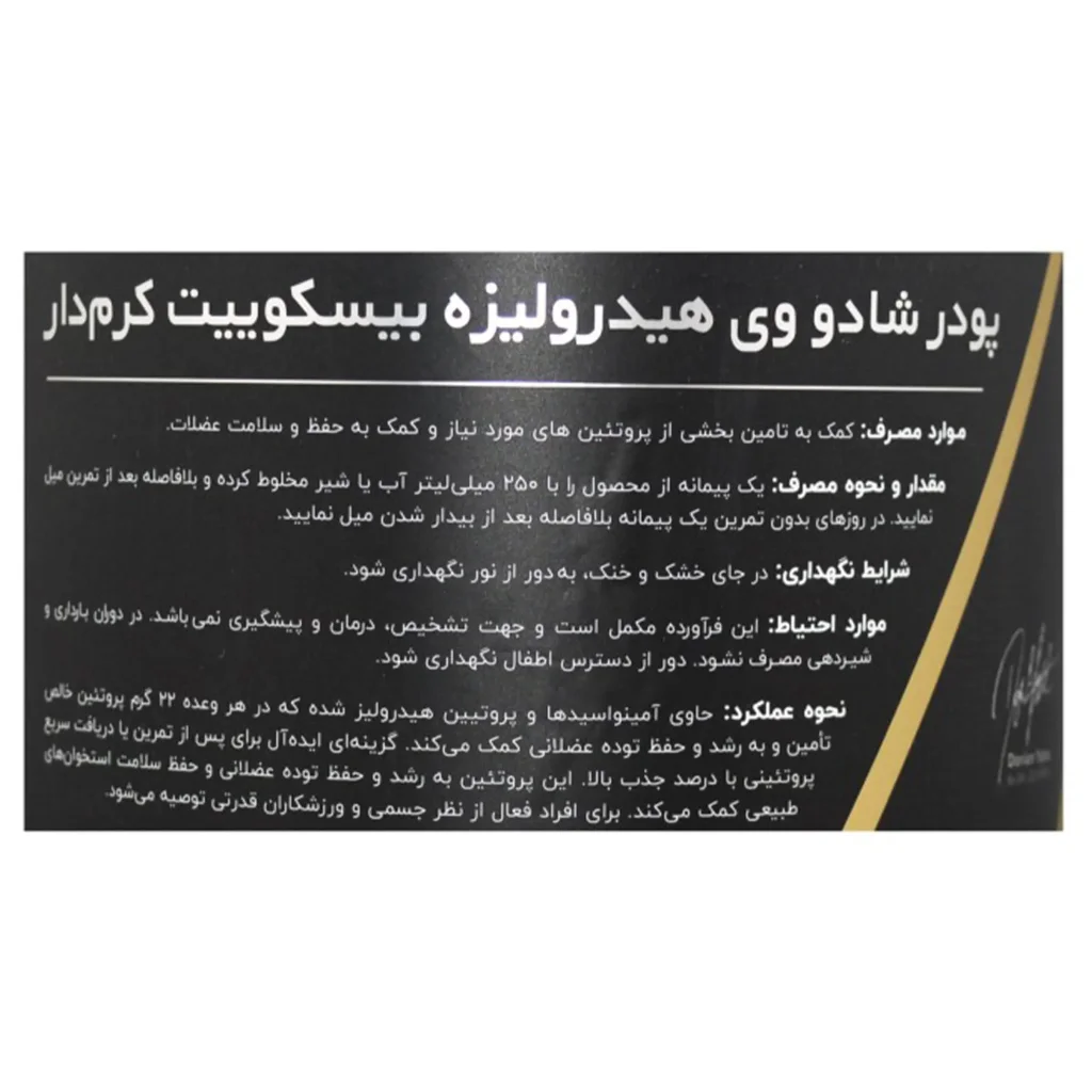 - مشخصات پودر شادو وی هیدرولیزه: وزن ۲.۲۷ کیلوگرم، فرم پودر، حاوی حدود ۹۰ سروینگ.