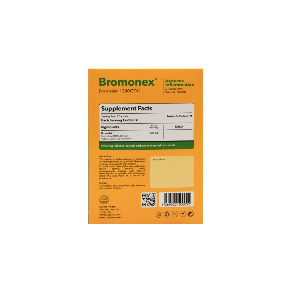 | احتیاط مصرف | در دوران بارداری و شیردهی زیر نظر پزشک مصرف شود و با داروهای رقیق کننده خون ، ضد انعقاد ها و ترمبولیتیک ها مصرف نشود و همچنین در صورت حساسیت به بروملین یا آناناس، از مصرف این فرآورده خودداری شود. |