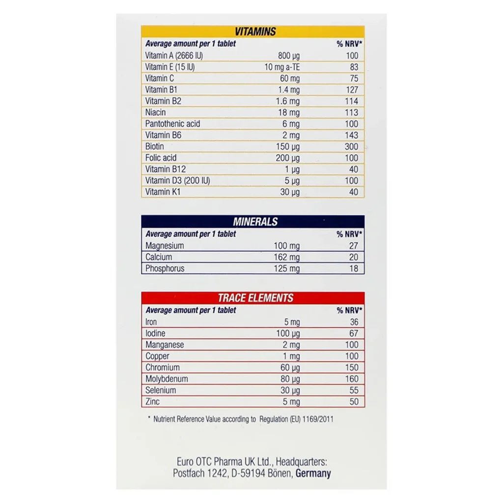 ویژگی های قرص مولتی ویتامین کامپلت یورو ویتال(100عددی)