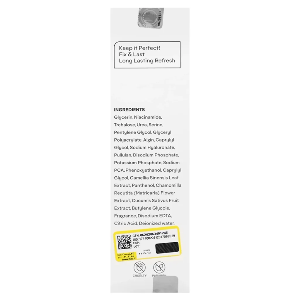 | مقدار و نحوه استفاده | برای فیکس کردن یا آماده سازی و احیای آرایش خود، قبل یا پس از آرایش با فاصله 10 تا 15 سانت از صورت، اسپری کنید. |