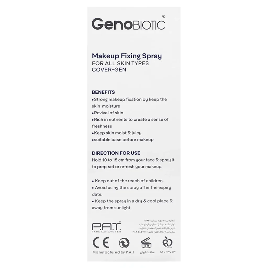 برای آنکه آرایشتان را تثبیت کنید و از بهم خوردگی آن جلوگیری کنید، بهتر است از تثبیت کنندههای آرایش استفاده کنید. اسپری رطوبت رسان و تثبیت کننده آرایش ژنوبایتیک یک محصول تاثیرگذار و کارآمد ایرانی است. این محصول به شما کمک میکند تا آرایش درست همانند ساعت اول، دست نخورده و تازه باقی بماند. پس از اتمام آرایش با استفاده از اسپری فیکساتور این برند به آرایش خود جلوهای بهتر و درخشانتر هدیه دهید. این محصول شما را در مسیر داشتن پوستی شاداب و آرایشی ماندگار کمک میکند.