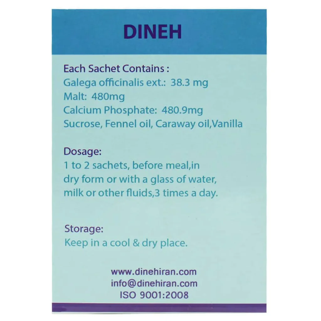 این داروی کمک درمانی از یک نمونه فرانسوی، شبیهسازی شده است. برای تهیه آن از عصاره علف شیر یا علف گالگا استفاده میشود. بهجز عصاره این گیاه که در تولید شیر مؤثر است، مالت و فسفات کلسیم نیز در ساختار این محصول وجود دارد. این مواد سبب میشود تا علاوه بر تأمین شیر برای نوزادان، بدن زنان شیرده نیز تقویت شود. ساکاروز موجود در ساشه شیرافزاری گیاهی لاکتودین دینه باعث میشود تا زنان شیرده دچار افت قند نشوند. بهجز این مواد، رازیانه و زیره نیز در این ساختار این محصول وجود دارد که سبب میشود تا بانوان شیرده دچار نفخ نشده و از طعم خوشایند آن، لذت ببرند.