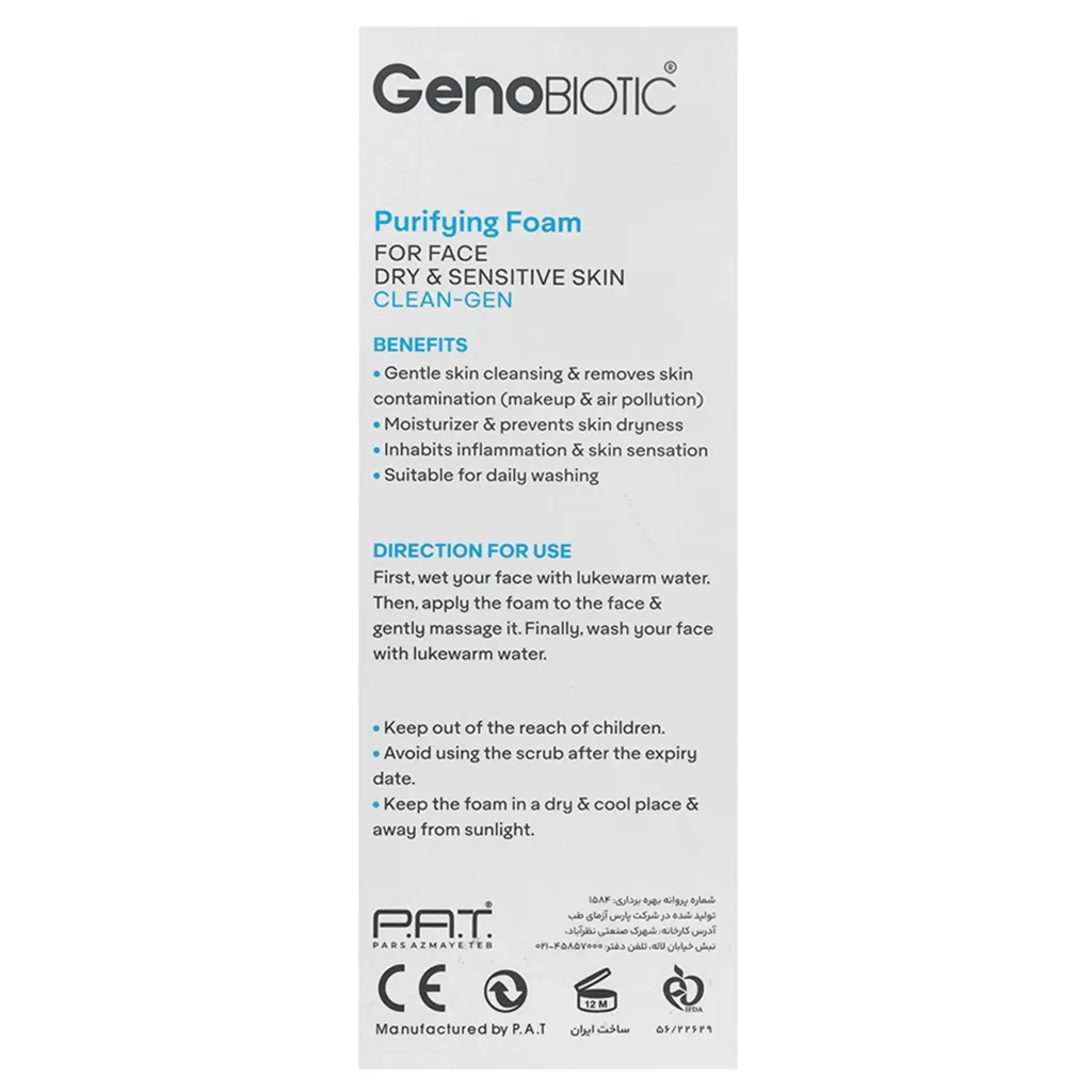 فوم شستشوی صورت ژنوبایوتیک (مخصوص پوست های خشک و حساس)، یکی از محصولات مراقبتی پوست به شمار آمده که دارای ترکیباتی نظیر اوره و سدیم پیرولیدین کربوکسیلات می باشد. این فرمولاسیون ویژه خاصیت مرطوبکنندگی برای پوست داشته و سبب آبرسانی قوی و ماندگاری طولانی مدت برای پوست را به دنبال خواهدداشت. به واسطه داشتن خاصیت ضد التهابی و التیام بخشی در این کرم، میتوان از آن برای پوستهای حساس هم استفاده کرد. این فوم دارای فرمولاسیون ویژه بوده و فاقد پارابن و سولفات میباشد. این فوم می تواند آلودگی ها و چربی روی پوست را کنترل کرده و از ایجاد جوش و آکنه و چربی زیاد برروی پوست جلوگیری کند.