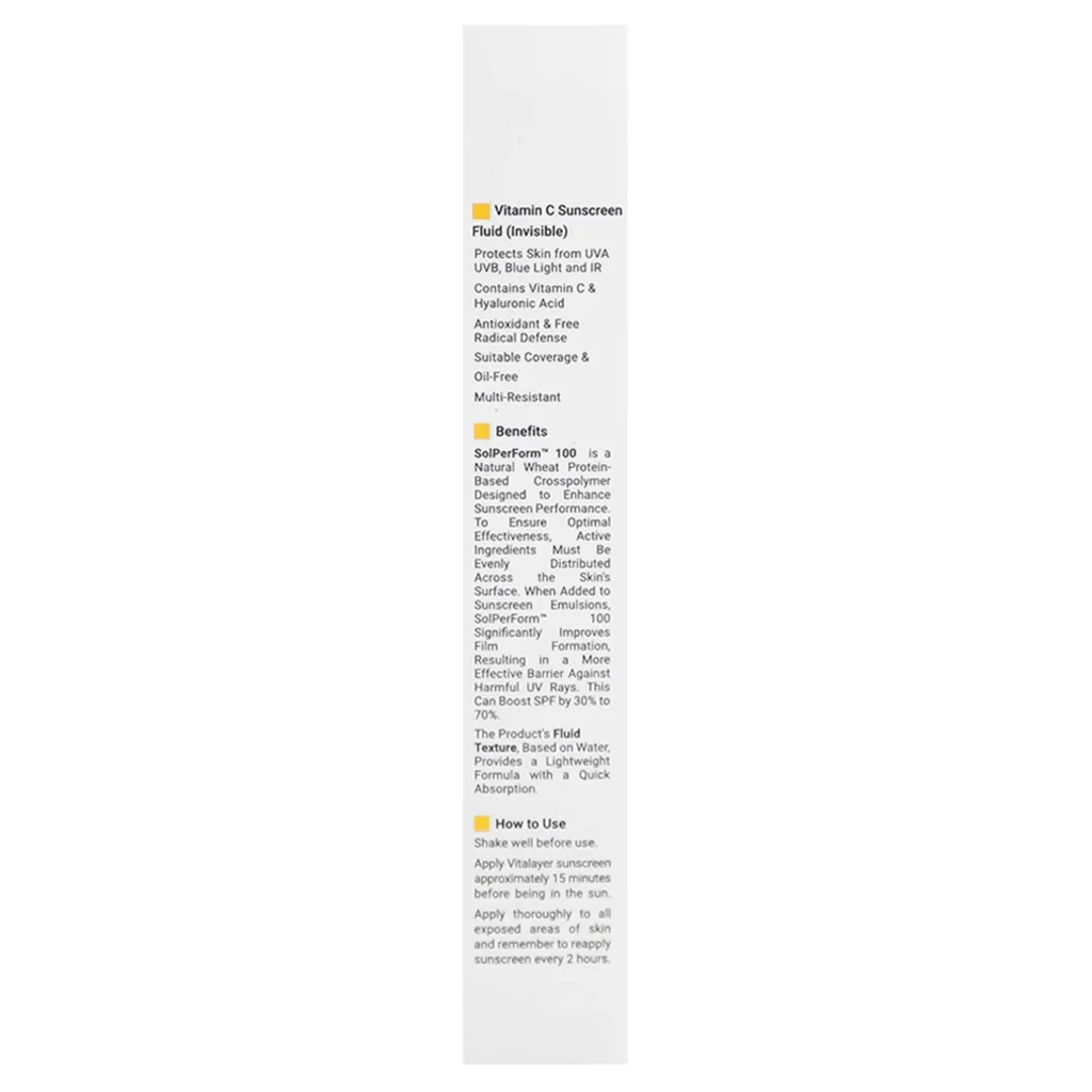 کرم ضدآفتاب حاوی ویتامین سی (spf 50) ویتالیر از پوست در برابر تمامی اشعههای مضر خورشید به خوبی محافظت کرده، مانع لک شدن و پیری زودرس پوست میشود و توسط ترکیبات آنتیاکسیدانی قوی آثار مخرب رادیکالهای آزاد بر پوست را خنثی میکند. کرم ضدآفتاب رنگی SPF50 حاوی ویتامین C ویتالیر دارای بافتی سبک، ضدتعریق و ضد آب است که علاوه بر ماندگاری چند ساعته، به سرعت جذب پوست میشود و ظاهری صاف و یکدست به پوست میبخشد. همچنین این کرم فاقد مواد حساسیتزا و پارابن بوده و به همین دلیل باعث بروز حساسیت نمیشود و با انواع پوست سازگاری بالایی دارد.