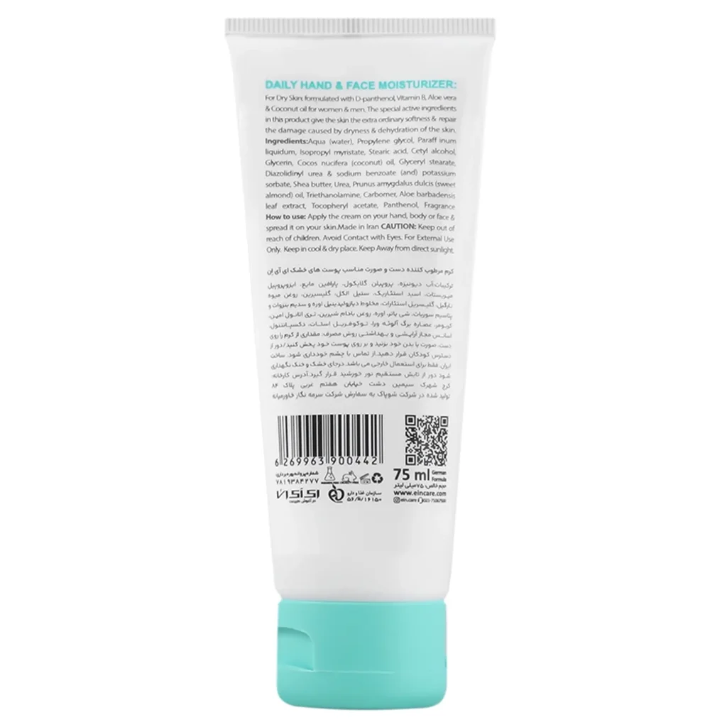 کرم مرطوب کننده دست و صورت پوست خشک ای آی ان یک محصول باکیفیت و موثر برای تامین نیازهای پوست خشک شماست. این کرم با استفاده از مواد طبیعی و مغذی، پوست شما را لطیف، نرم و شاداب میکند. روغن نارگیل، روغن جوجوبا، عصاره آلوئه ورا، پانتنول، روغن درخت چای و سایر ویتامینهای مغذی برای پوست در این محصول به کار رفتهاند.