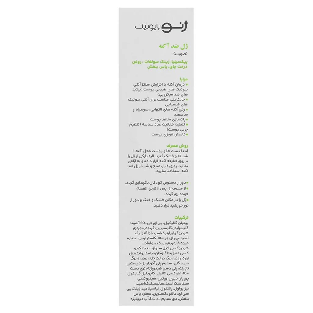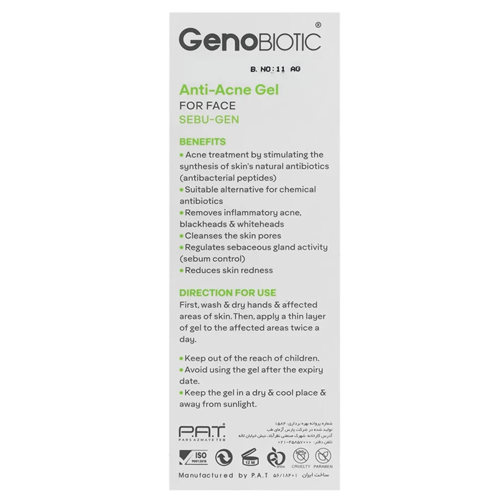 ژل ضد آکنه صورت ژنوبایوتیک، یکی از محصولات مراقبتی پوست بوده که برای درمان و پیشگیری از آکنه صورت مورد استفاده قرار میگیرد. این ژل دارای پایه گیاهی بوده و به کنترل چربی پوست و کنترل باکتری مولد آکنه کمک خواهدکرد. این محصول با پوست صورت سازگار بوده و هیچگونه عوارض جانبی ندارد. همچنین در دراز مدت به کوچک شدن منافذ پوست کمک کرده و از بروز جوش و آکنه جلوگیری خواهدکرد.