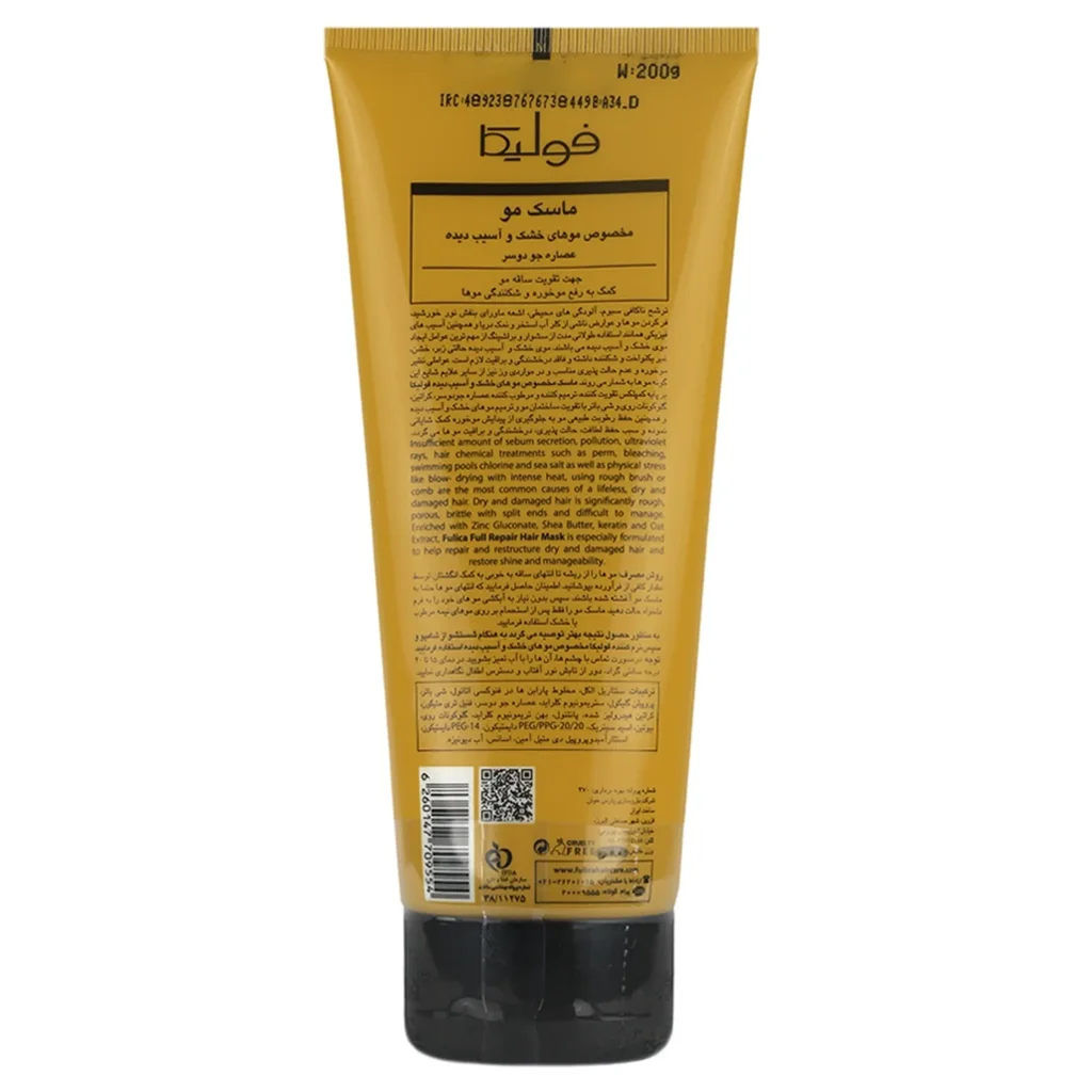 ماسک فولیکا (مخصوص موهای خشک و آسیب دیده)، از خشکی موها جلوگیری کرده و به شانه پذیری و حالت دهندگی موها کمک میکند. این ماسک مو به دلیل داشتن شیر جو دوسر، شی باتر و سایر روغن های گیاهی به ترمیم و بهبود خشکی موها کمک می کند