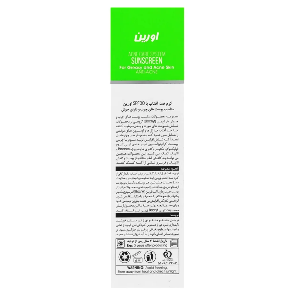 کرم ضدآفتاب پوست چرب و آکنه ای اورین (SPF30)