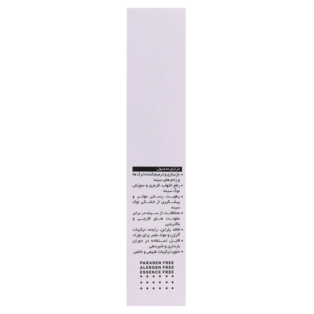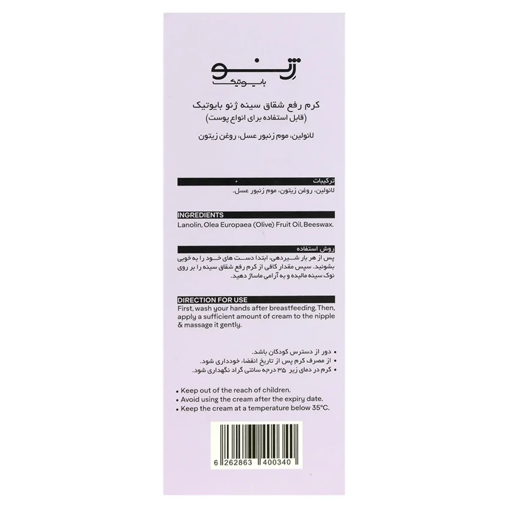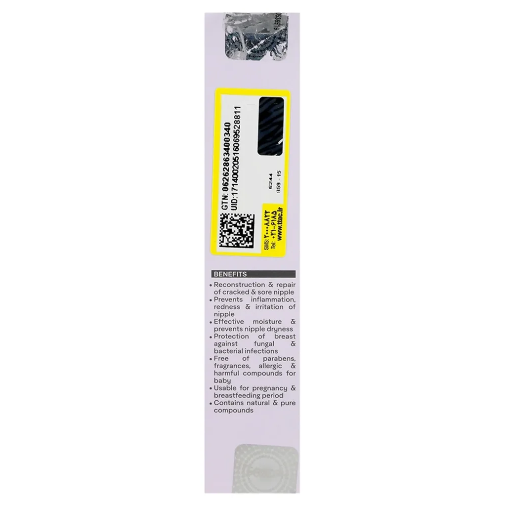 | مقدار و نحوه استفاده | پس از هر بار شیردهی، ابتدا دست های خود را به خوبی بشوئید. سپس مقدار کافی از کرم رفع شقاق سینه را بر روی نوک سینه مالیده و به آرامی ماساژ دهید |