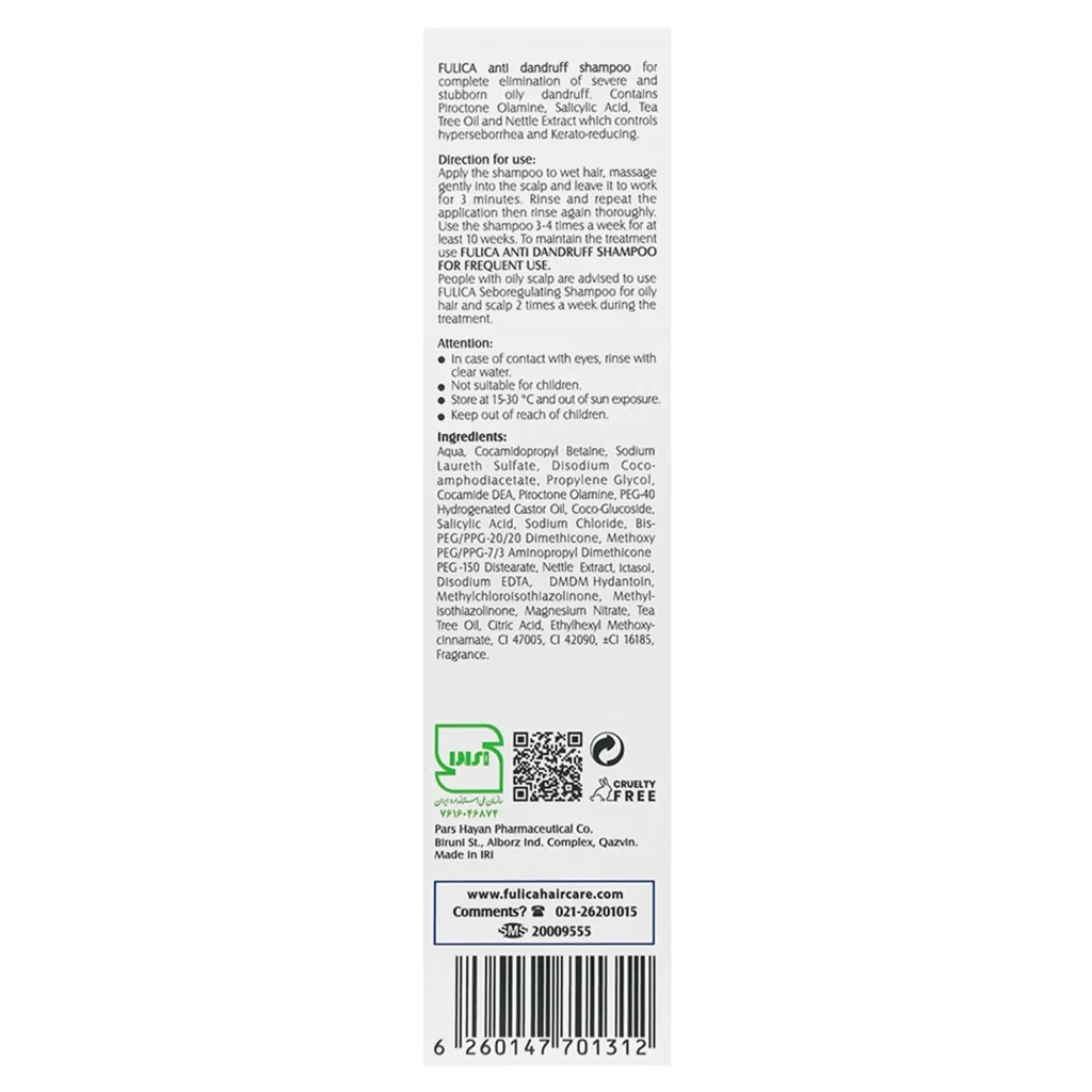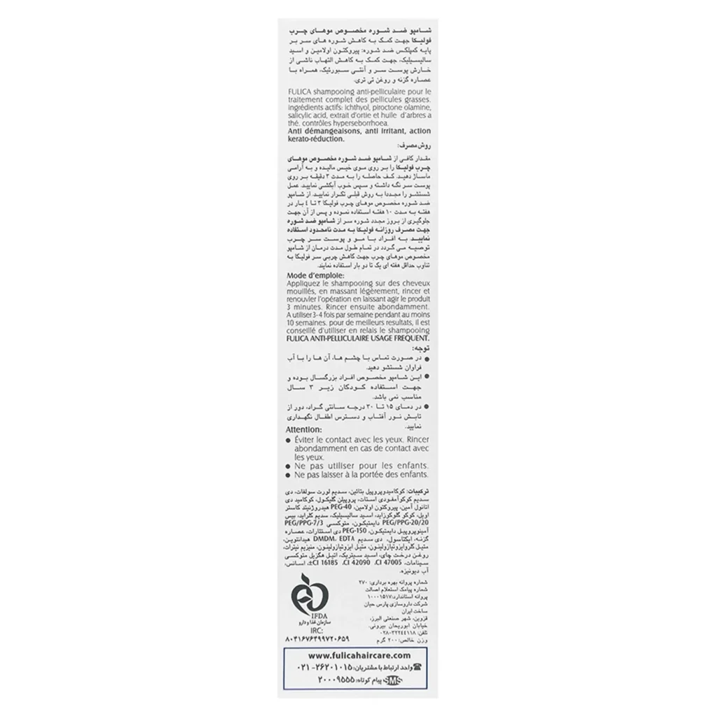 شامپو ضدشوره مخصوص پوست سرچرب فولیکا، یکی از محصولات مراقبتی و بهداشتی برای پوست سر چرب است. این شامپو از فرمولاسون ویژهای شامل کمپلکس ضدشوره ایکتیول، پیروکتون اولامین، اسیدسالسیلیک، ضد خارش، و عصاره گزنه و روغن درخت چای ساخته شدهاست. وجود این فرمولاسیون به محصول کمک کرده تا به درمان شورههای مقاوم، کنترل ترشح چربی، خارش کف سر و التهابات پوستی بپردازد.