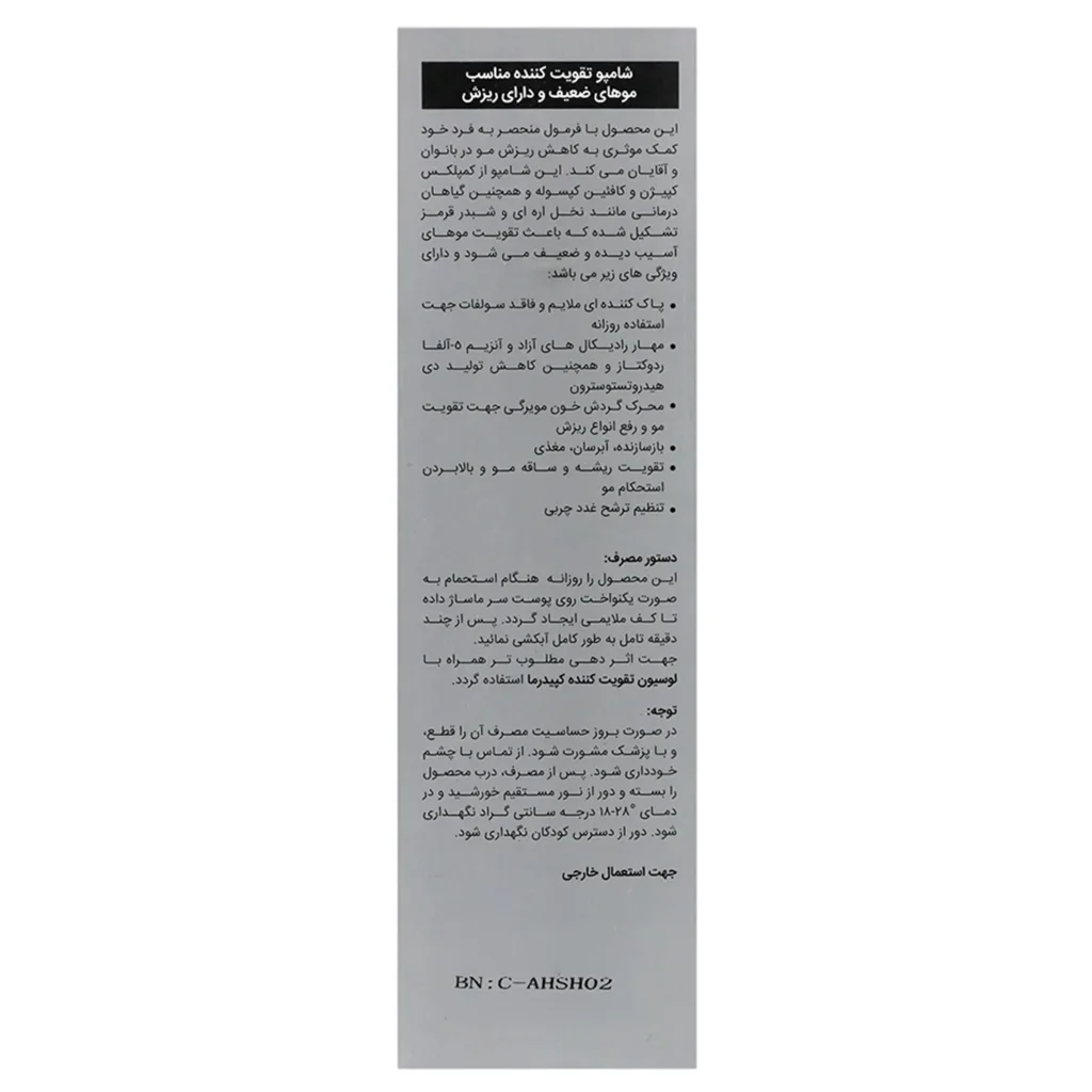 شامپو تقویت کننده مو کپیدرما،یکی از محصولات بهداشتی مراقبتی مربوط به مو بوده که به منظور تقویت و جلوگیری از ریزش موی سر مورد استفاده قرار میگیرداین محصول با فرمولاسیون ویژه خود از ریزش موی سر جلوگیری کرده و همچنین به افزایش رشد مو کمک می کند