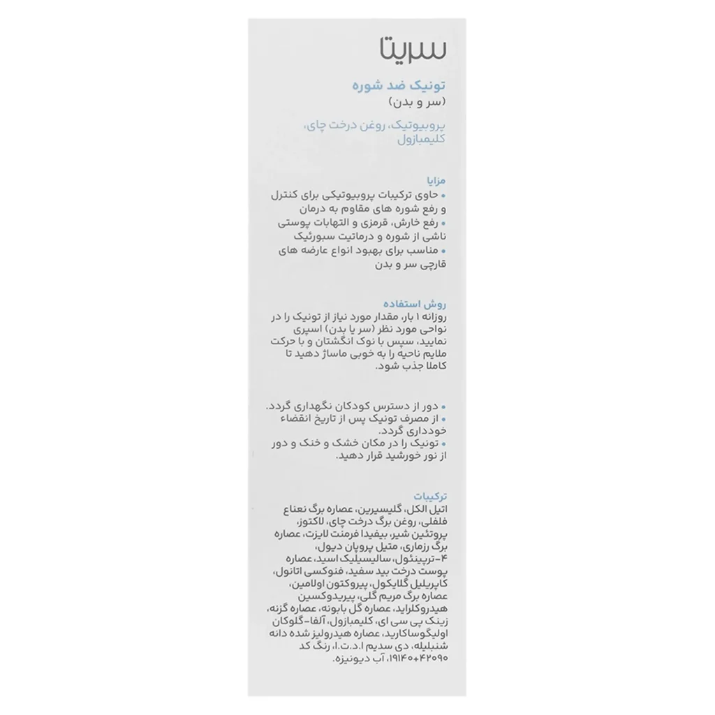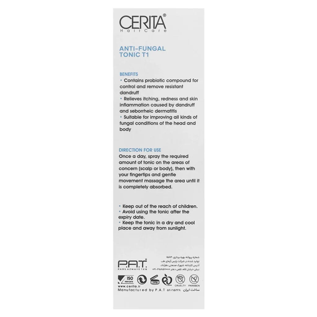 این تونیک در درمان درماتیت سبورئیک بسیار موفق عمل مینماید و دارای اثری سریع و طولانی مدت میباشد. به علاوه، تونیک گیاهی ضد شوره مو T1 سریتا، به پاکسازی پوست کف سر و موها از فلس ها و ورقههای سفید و آزار دهنده میپردازد و سلامتی و شادابی را به موها و پوست کف سر هدیه میدهد. همانطور که میدانیم شوره سر منجر به ریزش مو می گردد. تونیک گیاهی ضد شوره مو سریتا، از فرمولاسیونی بهره میبرد که ریزش موهای ناشی از شوره سر را کاهش میدهد و موجب افزایش خون رسانی به پوست سر ، تقویت و استحکام ریشه مو میگردد. انواع شوره سر مقاوم به درمان نیز، توسط این محصول سریتا درمان خواهند شد.