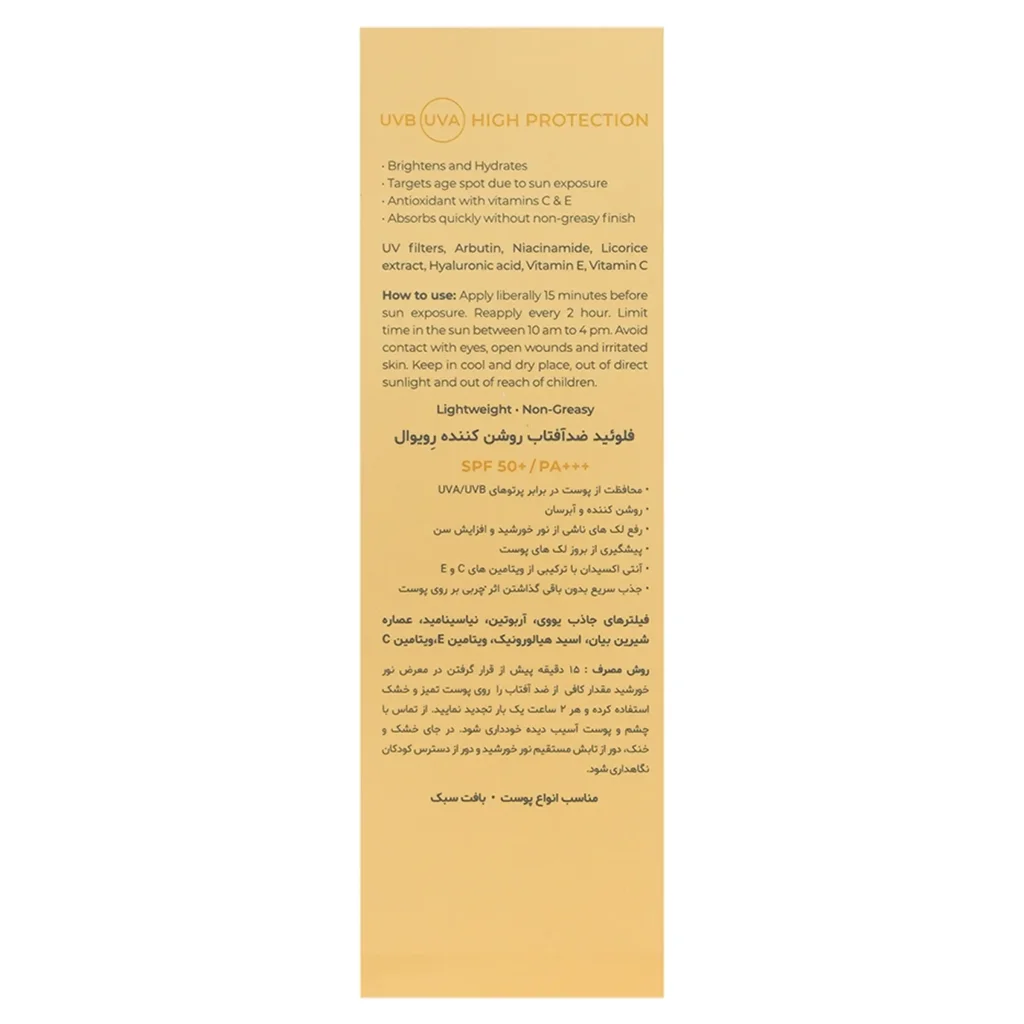 کرم ژل ضد آفتاب روشن کننده رویوال با برخورداری از فاکتور حفاظتی SPF50، طیف وسیعی از پرتوهای UVA و UVB را که عامل اصلی پیری زودرس، چینوچروک، لک و تیرگی پوست و حتی سرطان پوست هستند، به طور کامل جذب و خنثی میکند.