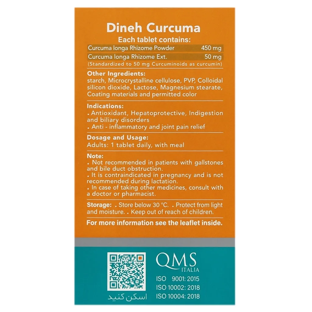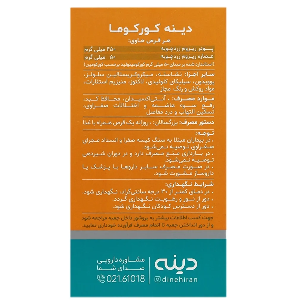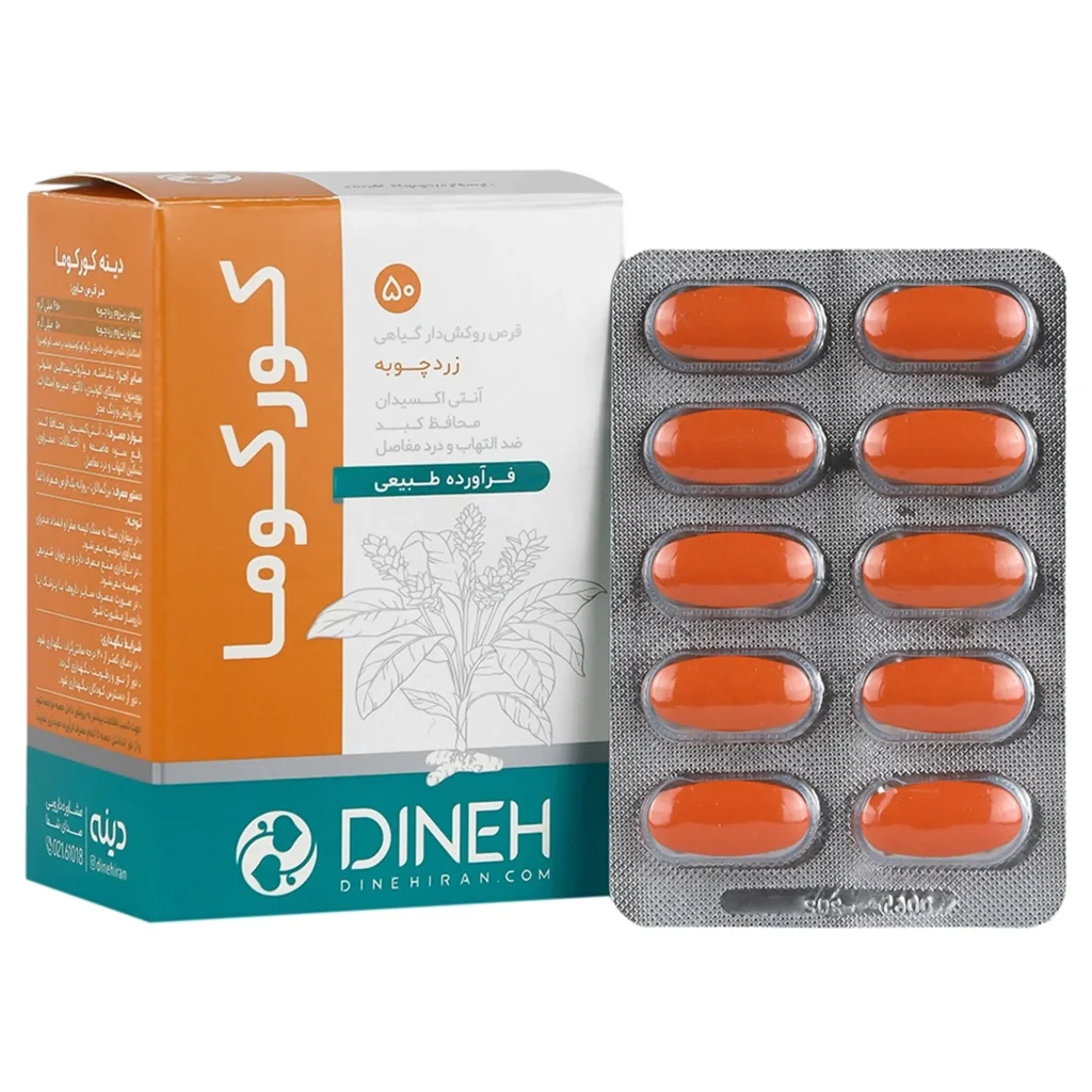 قرص کورکوما دینه، یکی از محصولات دارویی بوده که حاوی عصارهکورکوما یا همان زردچوبه بوده و در حفظ سلامت استخوانها، غضروف ها و مفاصل موثر است. این محصول با فرمولاسیون ویژه خود قادر است تا به درمان دردها و خشکی استخوانها و مفاصل پرداخته و در نهایت از بروز بیماریهایی نظیر آرتروز جلوگیری کند. این محصول در کنار برطرفکردن دردها و سایر مشکلات مفصلی، قادر است تا به بهبود حرکت و جلوگیری از تخریبهای غضروفی و استخوانی پرداخته و با داشتن خاصیت ضدالتهابی از بروز هرگونه مشکل در سالمندان و بیماران دارای مشکلات مفصلی جلوگیری کند. این محصول همچنین قادراست تا علائم آرتروز نظیر استفراغ، تهوع و سوهاضمه را بهبود بخشد.