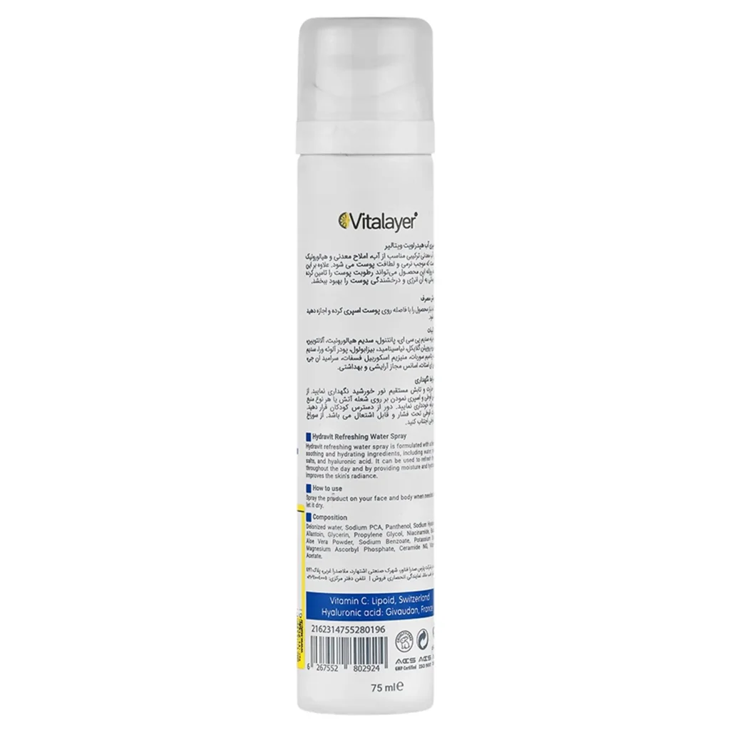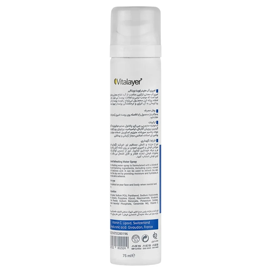 اسپری آب ویتالیر (مدل Hydravit) یک محصول مراقبت از پوست است که با هدف تامین رطوبت، شادابی و درخشش به پوست طراحی شده است. این محصول حاوی آب، املاح معدنی و هیالورونیک اسید است که به عمق پوست نفوذ کرده و آن را تغذیه میکند. اسپری آب ویتالیر (مدل Hydravit) به ویژه برای افراد با پوست خشک و حساس مناسب است و با استفاده منظم به بهبود بافت و ظاهر پوست کمک میکند. استفاده آسان و سریع از اسپری آبرسان ، آنرا به یک انتخاب ایده آل برای استفاده روزانه به ویژه در فصول گرم یا در شرایطی که پوست نیاز به تجدید رطوبت فوری دارد، تبدیل کرده است. اسپری آب ویتالیر به عنوان یک محصول مراقبت از پوست دارای خواص متعددی است که به بهبود و حفظ سلامت پوست کمک میکند.