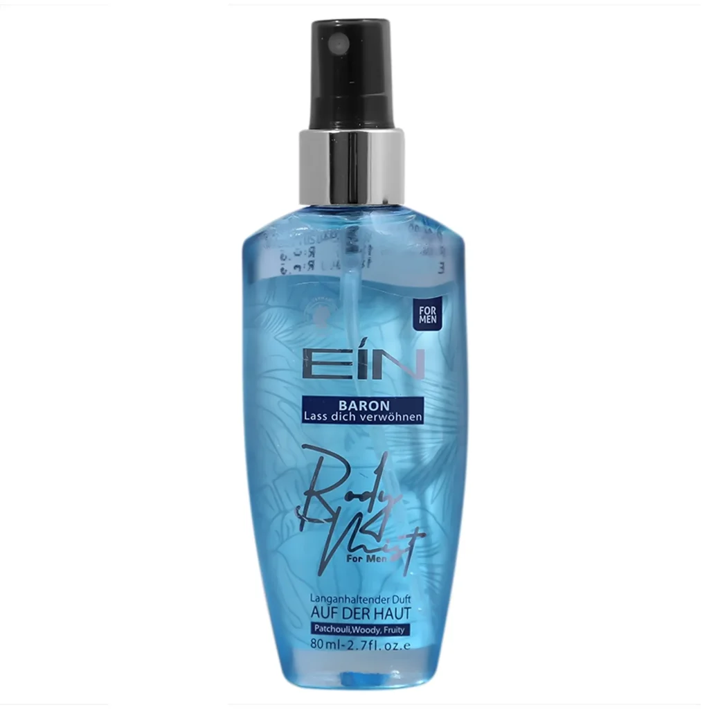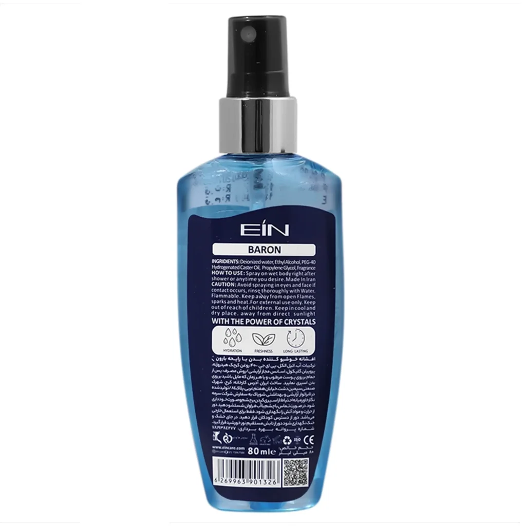 بادی اسپلش مردانه ای آی ان (BARON) محصولی از برند ایرانی ای آی ان است. این محصول یک اسپری خوشبو کننده بدن مخصوص آقایان بوده که استفاده از آن جایگزین بسیار مناسبی برای عطر جهت استفاده روزمره است. این بادی اسپلش رایحه ای شاداب کننده، چوب و میوه ای بر پایه مشک دارد. این محصول علاوه بر خوشبو کردن بدن همچنین پوست را رطوبت رسانی نیز می کند.