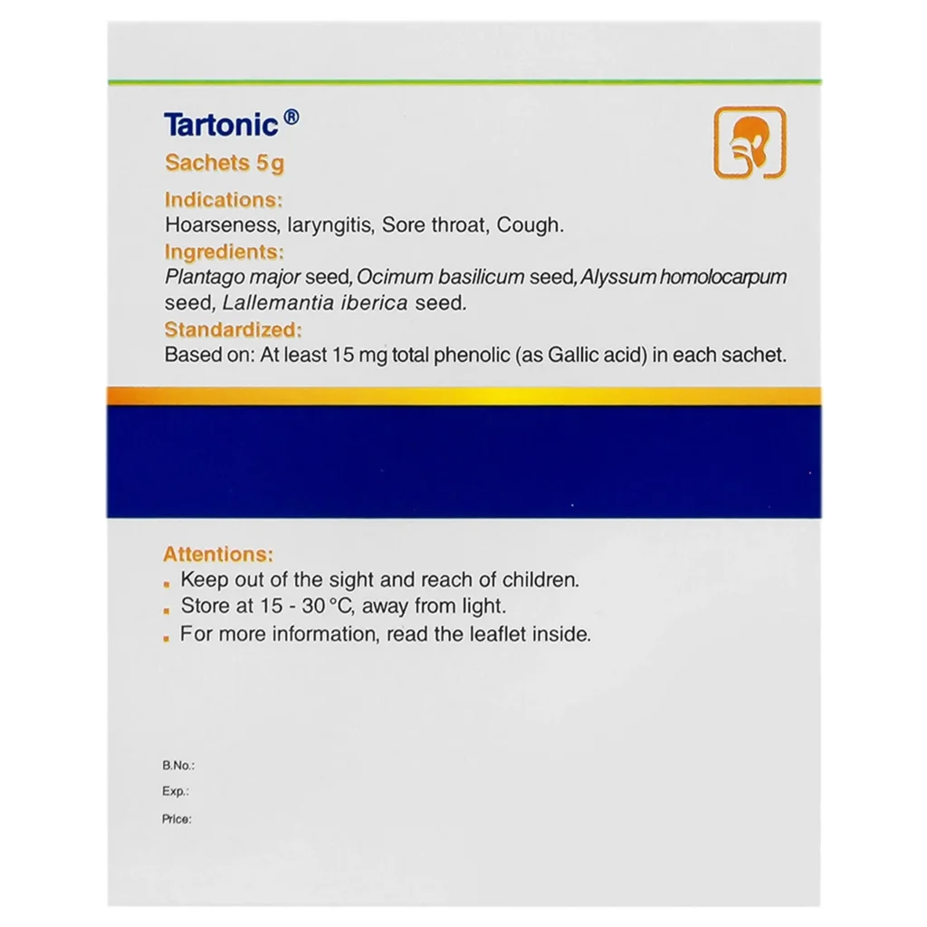 این محصول با داشتن موسیلاژ و ترکیبات ضدالتهابی، به نرم شدن تارهای صوتی و رفع گرفتگی صدا کمک میکند؛ در نتیجه برای خوانندگان، گویندگان و افرادی که به طور مداوم از صدای خود استفاده میکنند، بسیار مفید است. ساشه تارتونیک با ایجاد یک لایه محافظ روی مخاط حنجره، خشونت و التهابات آن را التیام میبخشد و به بهبود کیفیت و وضوح صدا کمک میکند. ترکیبات این ساشه با خاصیت خلطآور و ضدالتهاب، در دفع خلط و ترشحات مجاری تنفسی موثر است و سرفههای خشک و خلطدار را تسکین میبخشد. علاوه بر این ترکیبات این محصول با داشتن انواع ویتامینها و آنتیاکسیدانها، به تقویت سیستم ایمنی بدن و افزایش توانایی آن در مقابله با بیماریها کمک میکند.