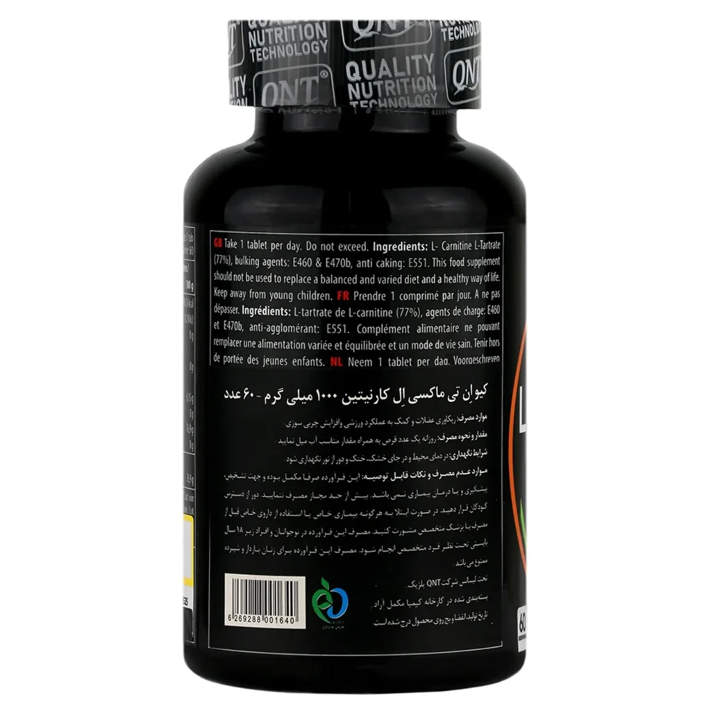 قرص ماکسی ال کارنتین 1000 میلی گرم کیو ان تی تحت لیسانس QNT بلژیک، در کارخانه کیمیا مکمل آراد در ایران تولید و بسته بندی شده است.