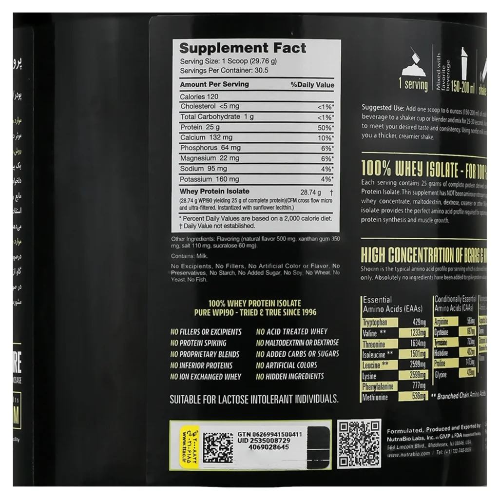 ویژگیهای پروتئین وی نوترابایو ایزوله (907 گرمی)