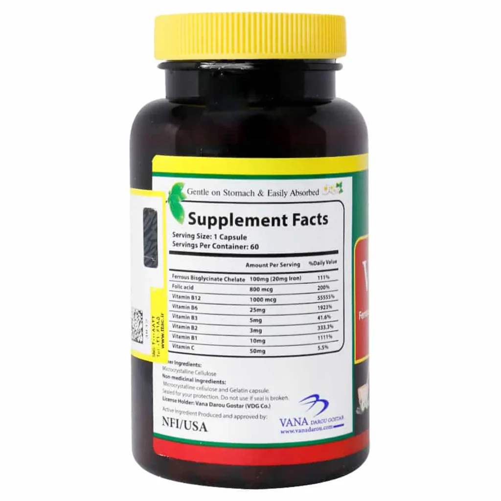 - بهترین حالت مصرف کپسول وانا آیرون نورم لایف، روزانه یک عدد قرص همراه با غذا زیر نظر پزشک متخصص است.